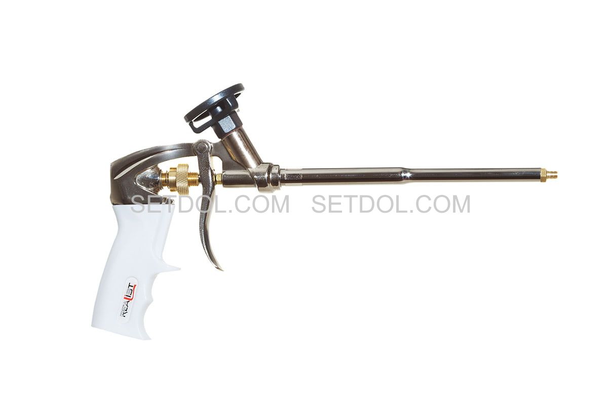 Прочный корпус изготовлен из антиадгезионных материалов, которые обеспечивают удаление затвердевшей монтажной пены с пистолета. Усовершенствованный обратный клапан улучшает герметичность адаптера пистолета. Специально подобранная жесткость пружины клапана обеспечивает больший выход монтажной пены. Устройство используется для равномерной подачи монтажной пены в технологический шов. Баллон открывается при лёгком нажатии на клавишу. Комплектуется специальной трубкой, с помощью которой пену можно подавать в труднодоступные места. Подающий привод изготовлен из износостойких материалов.